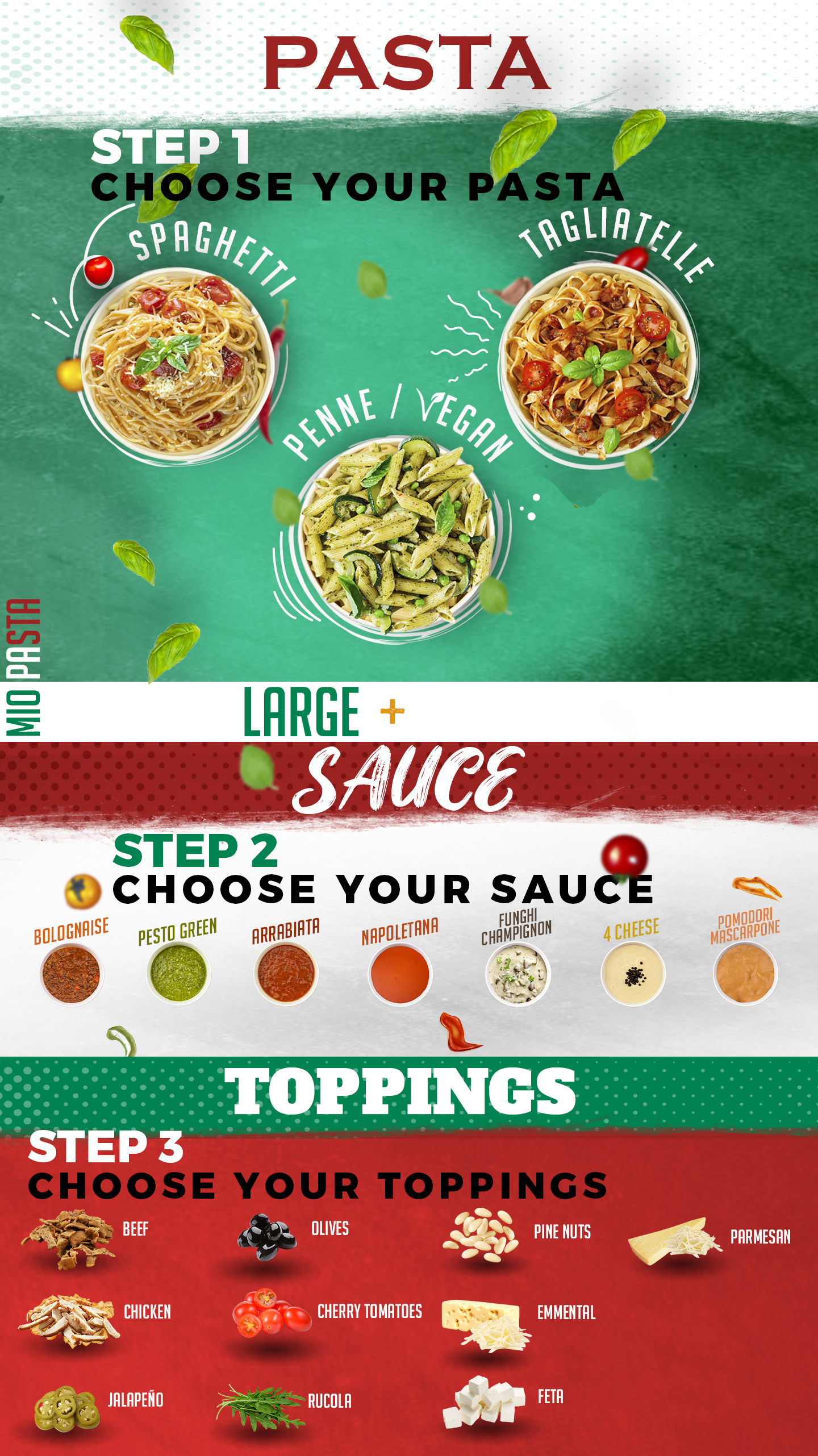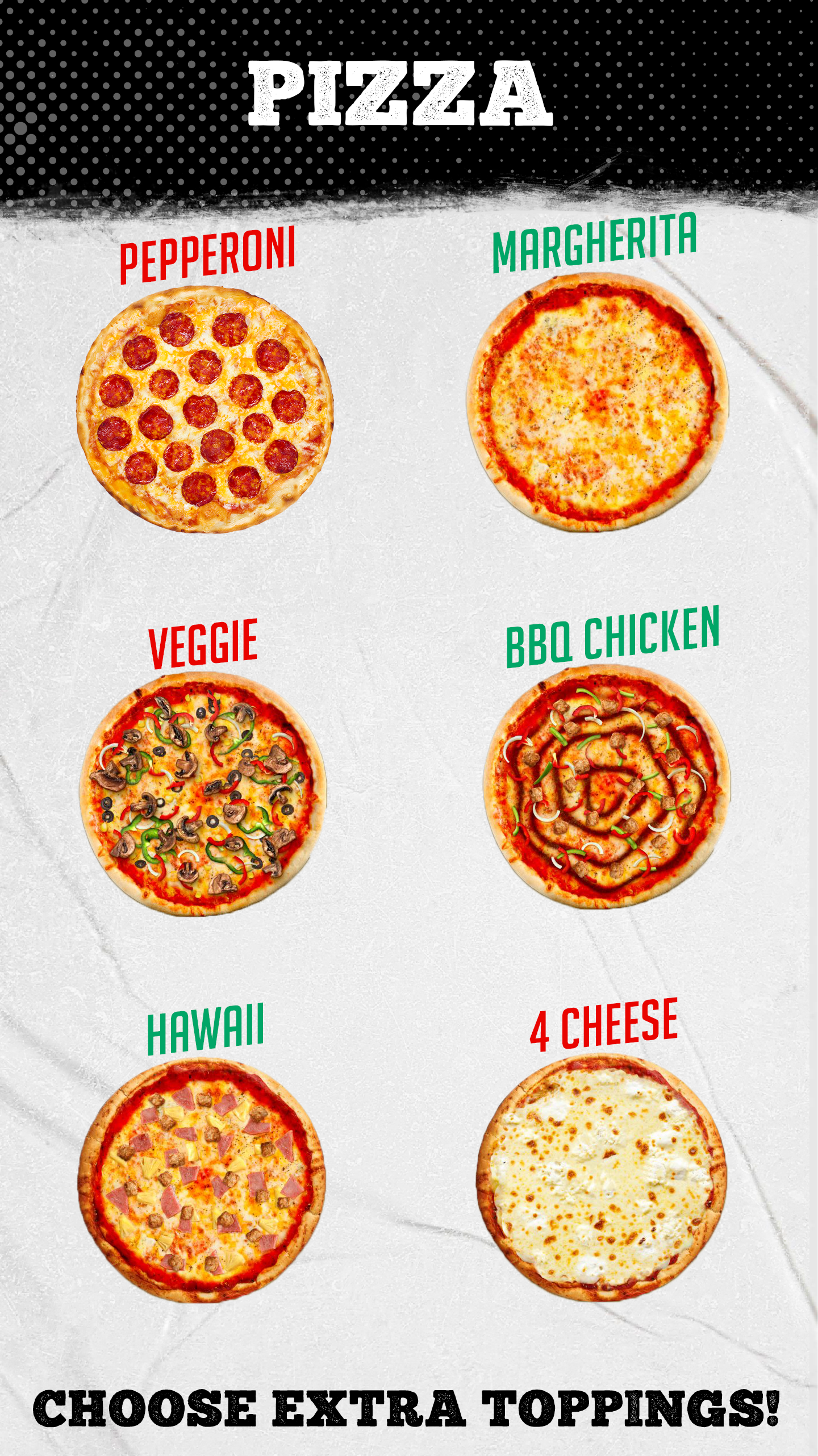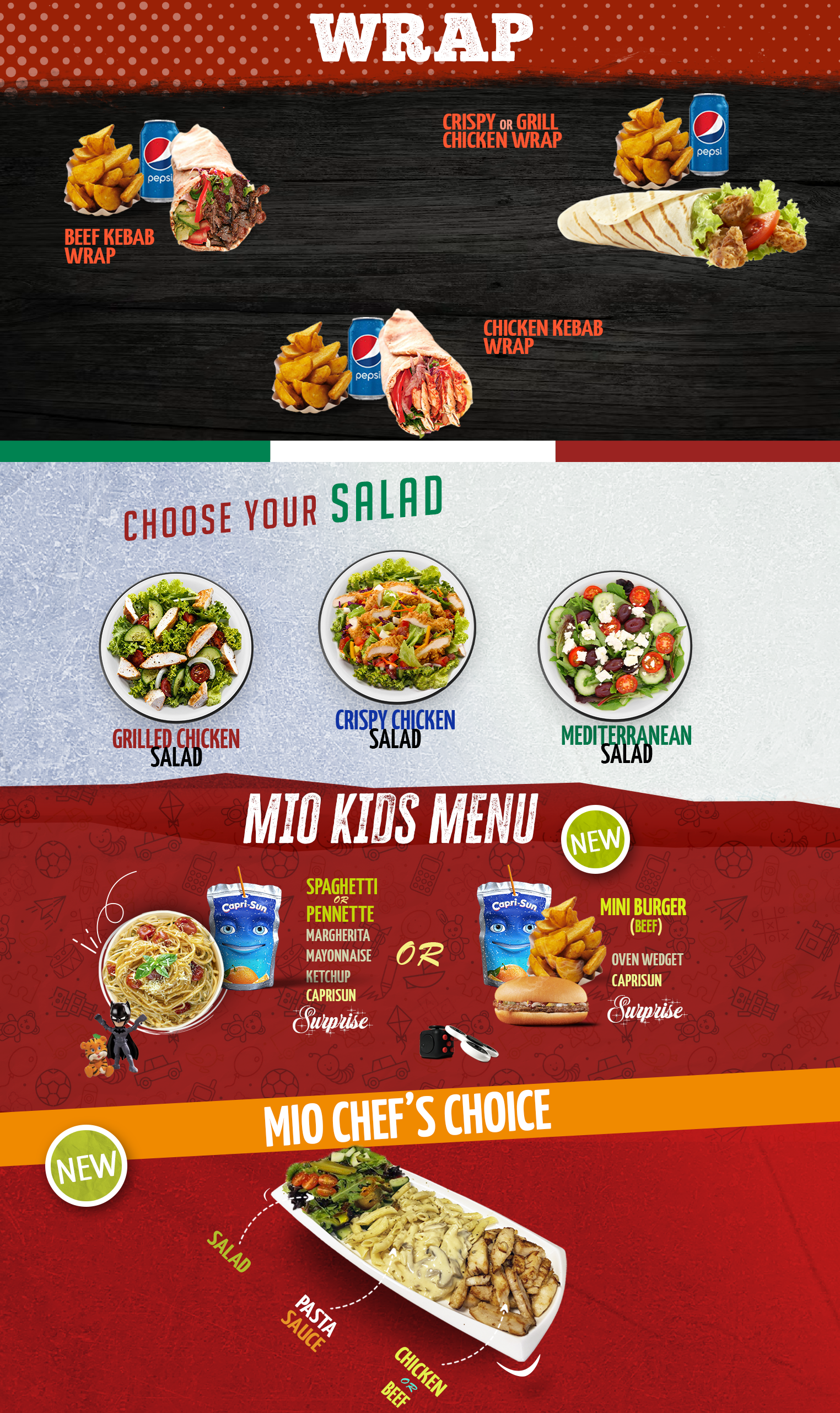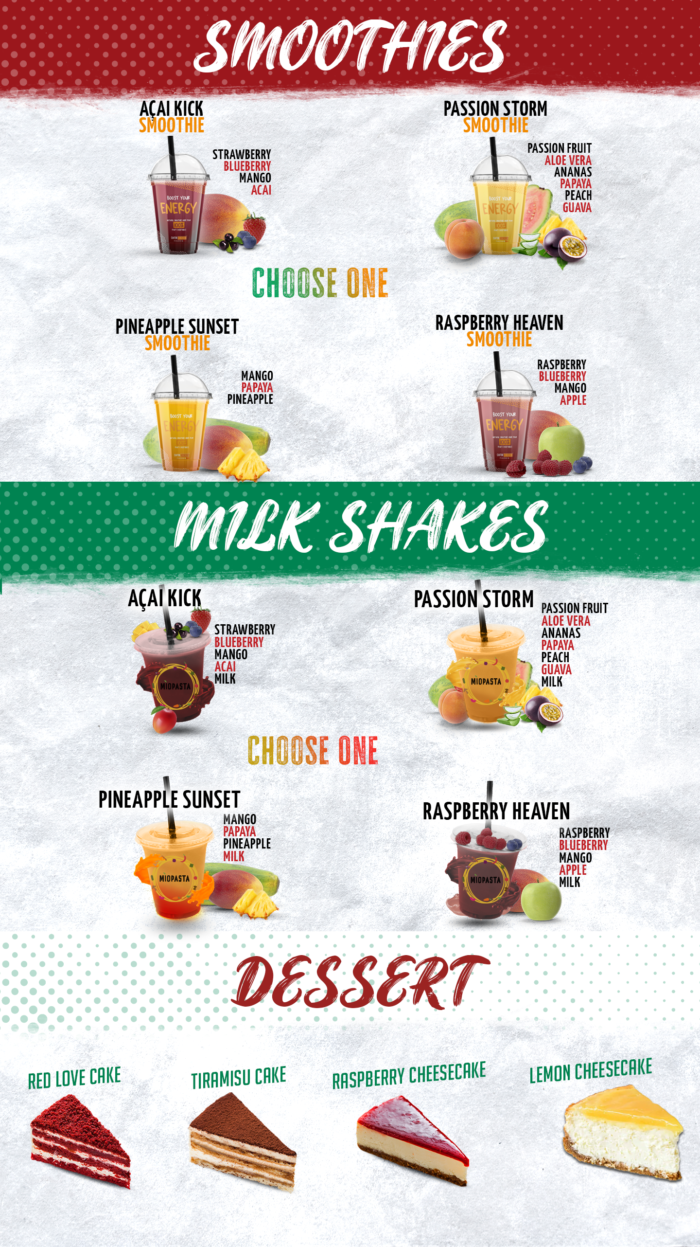 You can choose our delicious menus such as Pasta, Spaghetti, Penne Vegan, Wraps, Pizza, Burgers, and your own combinations.